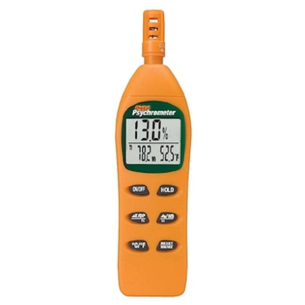El Hygrotermómetro con Psicrómetro, HygroTherm VentDepot mide humedad, temperatura del aire, temperatura de punto de rocío y temperatura de termómetro de bulbo húmedo.