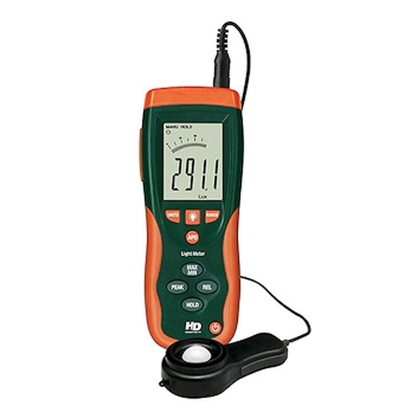 | El Luxómetro Digital LightMeter VentDepot, mide la iluminancia en Lux y Bujías pie. El LightMeter incluye una conexión para PC y software compatible cpn Windows para vigilancia en tiempo real y almacenar datos del nivel de luminosidad. Pantalla LCD grande de 4000 cuentas con retroiluminación y grafica de barras rápida de 40 segmentos. Función de retención al espectro CIE fotópica. Coseno corregido totalmente para incidencia angular de luz. Sensor foto diodo estable de larga duración con filtro de repuesta al espectro. Proporciona alta precisión. Función automática, y de retención de picos para captura de cambios en los niveles bajos de luz hasta 10mS. Apagado automático después de 20 minutos de inactividad. Memoria máxima y mínima de nivel de luz. Función de lectura relativa. Conexión USB a PC para captura de datos. La caja del Luxómetro Digital LightMeter está diseñada en doble molde para servicio pesado. | |||