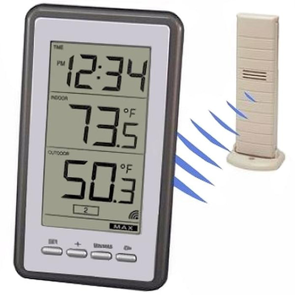 | VentDepot ya cuenta con el Termómetro Inalámbrico WirelessHour el cual registra la temperatura interior y exterior. El Termómetro Inalámbrico WirelessHour puede recibir información de hasta 3 sensores. Cuenta con un rango de temperatura interior de -9.9 a 59.9°C (14.2 a 139.8°F). Rango de temperatura exterior de -39.9 a 59.9°C (-39.8 a 139.8°F). Visualización de la hora (ajuste manual). Despliegue en horario de 12/24 horas. Con el Termómetro Inalámbrico WirelessHour usted podrá registrar la temperatura mínima y máxima de su habitación en °C y °F. El Termómetro Inalámbrico WirelessHour funciona con 2 pilas alcalinas “AAA” para el receptor y 2 pilas alcalinas “AA” para el sensor (no incluidas.) | |||